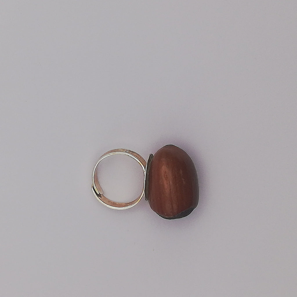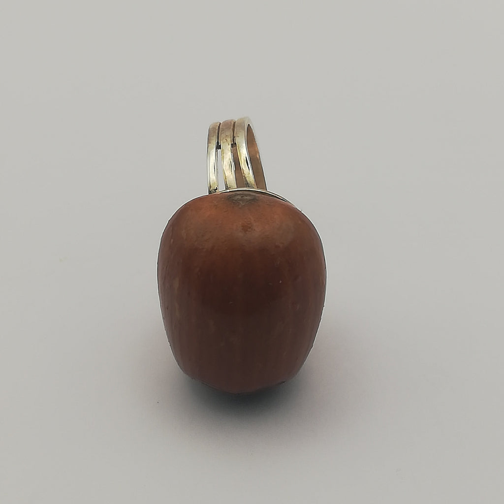 Symbole de sagesse, de patience et de nature nourricière, la noisette devient bijou dans cette création épurée et forte. Son volume lisse et sa teinte boisée s’accordent à merveille à l’anneau en métal argenté réglable.
