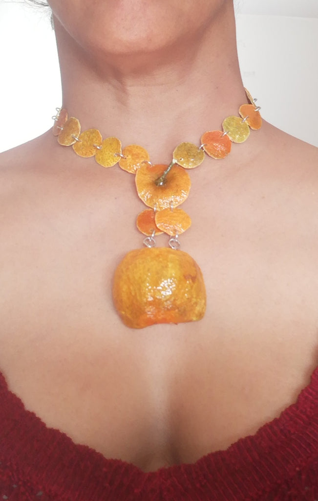 Collier réalisé à partir de véritable clémentine, prélevé sur de vrai végétaux qui une fois stabilisé avec des produits naturelles ce retrouvent avec une durée de vie prolongé de plusieurs mois, voir années avec de bon soin, gardant leurs souplesses naturelle durant plusieurs mois jusqu'à progressivement ce durcir jusqu'à leurs fin de vie.